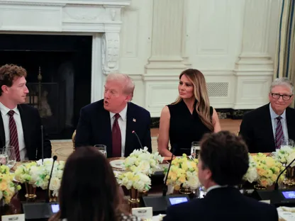 وأراد ترمب أن يكون العشاء الظهور الأول لحديقة الورود بعد تجديدها، لكن الأمطار دفعتهم إلى الانتقال إلى الداخل في غرفة الطعام، حيث وجد ترمب وزوجته أنفسهم محاطين بقيادات تكنولوجية وكبار مسؤولي الإدارة، بينهم ديفيد ساكس (قيصر الذكاء الاصطناعي والتشفير) وكبير موظفي البيت الأبيض سوزي وايلز.